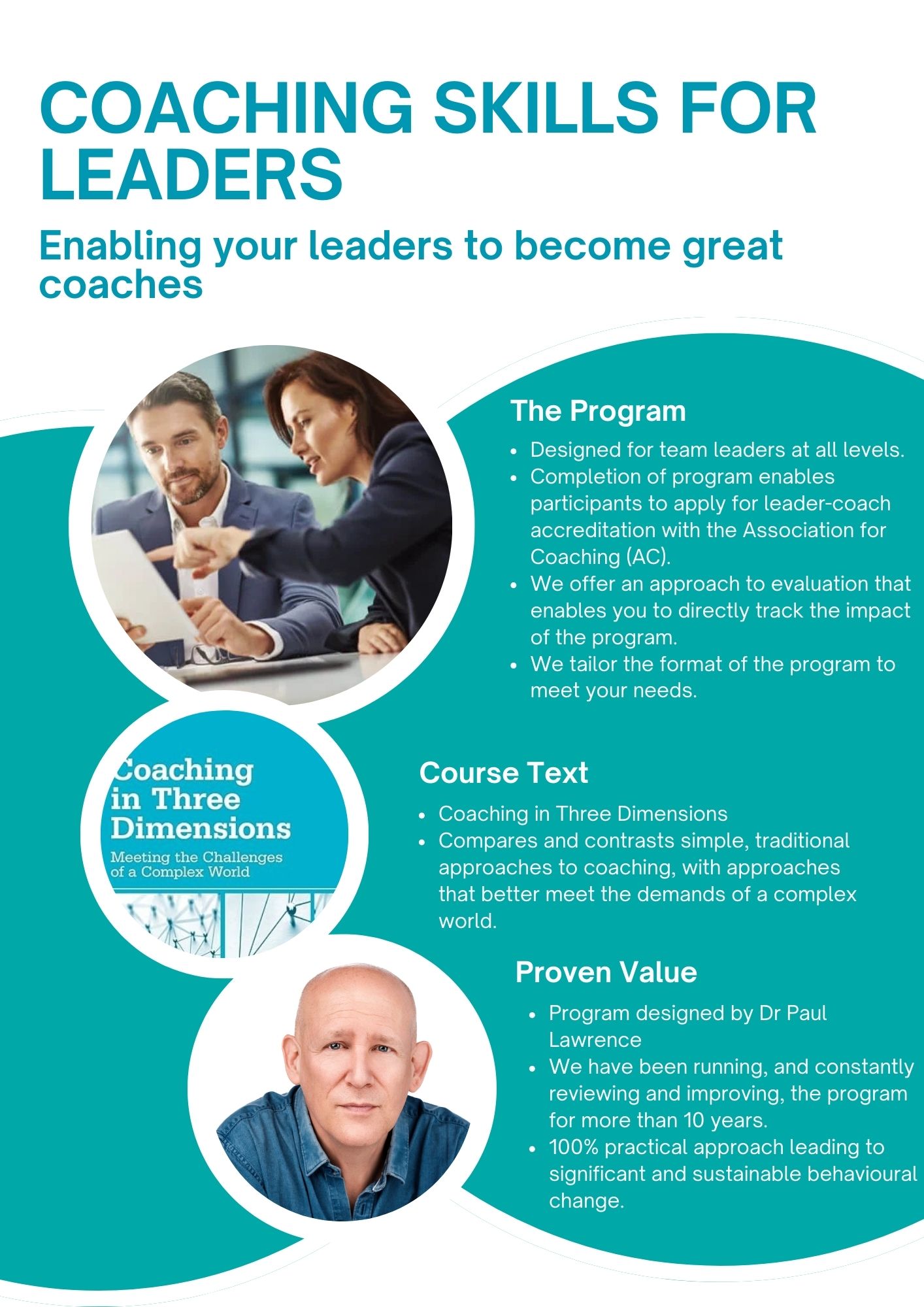 We have been running our Coaching Skills programs for more than ten years. Our programs are systemic and evidence-based, designed to help you transform the behaviours of all your leaders. We offer short programs, Foundations programs run over three months, or our Deep Dive program which usually runs for nine to ten months.